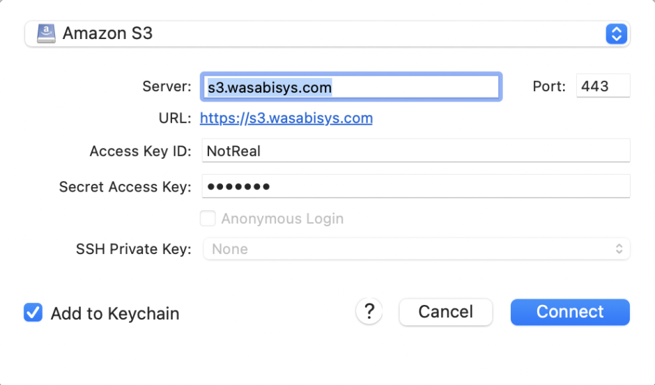 I setup a demo account with Wasabi, created a bucket and created a read and write key pair for the user. I used the Root Account Key and downloaded the key pair to my computer. I launched Cyberduck and prepared to use for something other than SFTP for the first time.